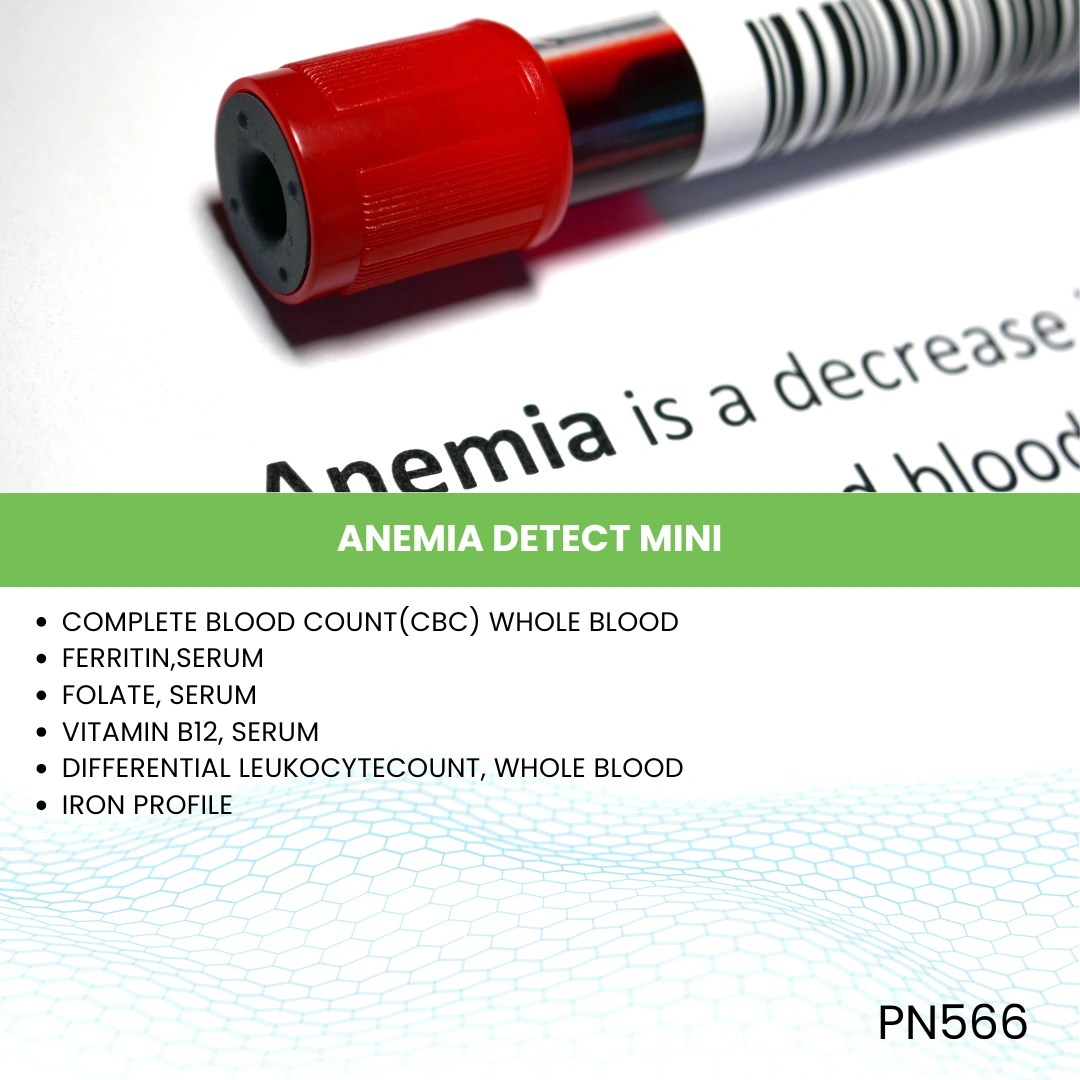 The Anemia Detect Mini is a simplified blood test panel designed to screen for anemia. Anemia is a condition in which the body does not have enough healthy red blood cells to carry adequate oxygen to tissues, leading to fatigue, weakness, and other health issues. This test provides a quick and focused evaluation using essential parameters rather than a full panel.