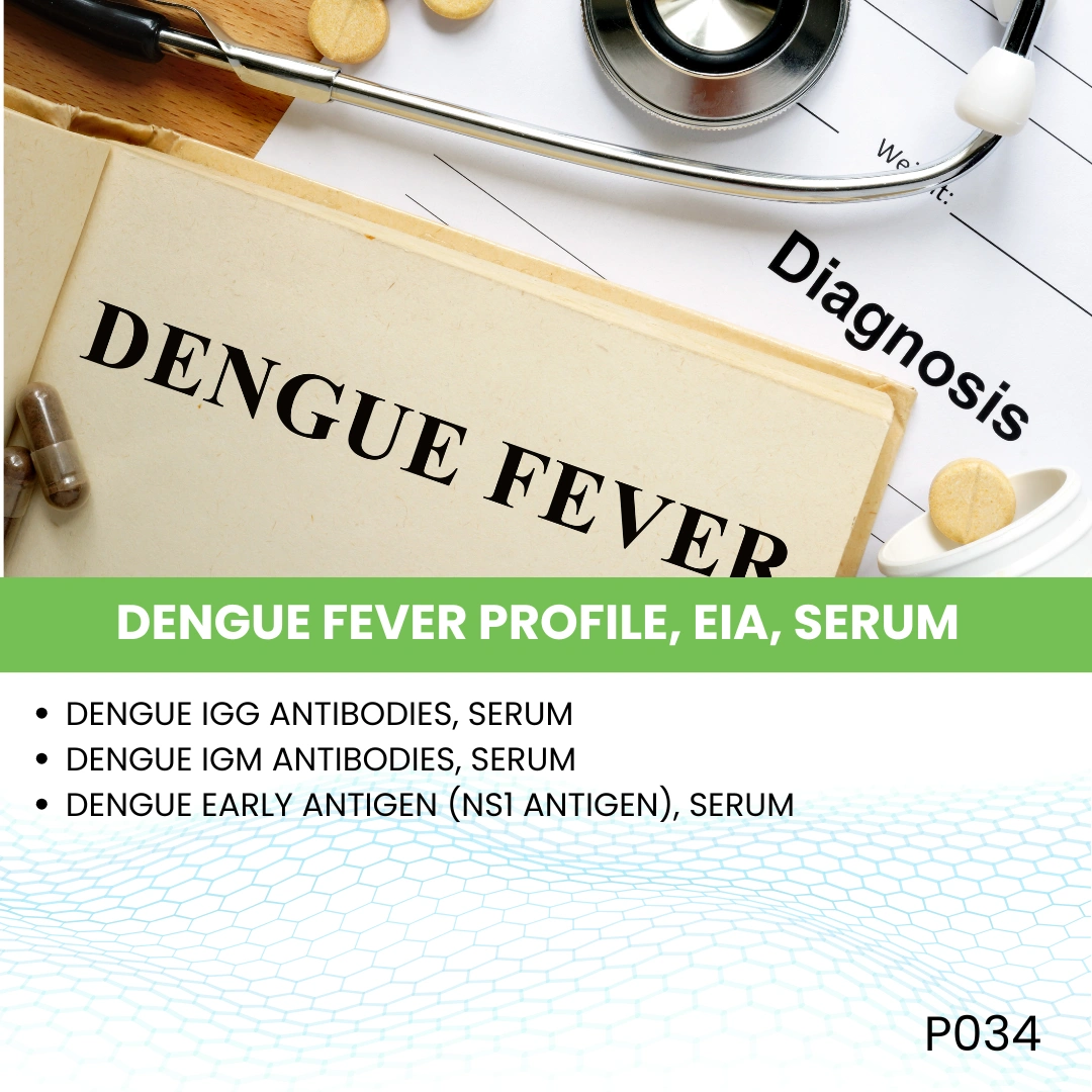 The Dengue Fever Profile, EIA (Enzyme Immunoassay), Serum test is a blood test that detects antibodies (IgM and IgG) against the dengue virus using EIA/ELISA technology. It helps determine both recent and past infections. This profile may also include NS1 antigen detection for early-phase diagnosis, providing a more comprehensive evaluation of dengue infection.