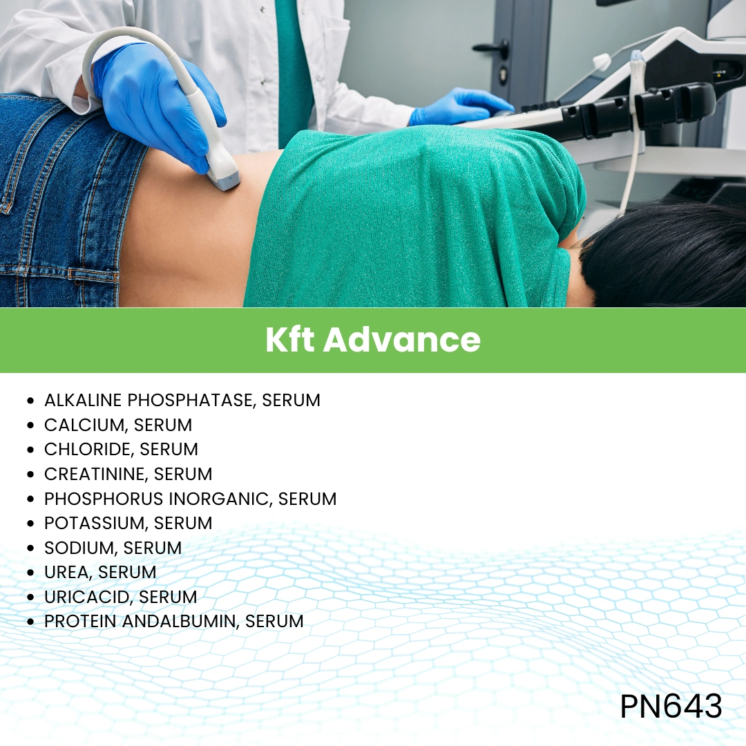 The KFT Advance is a comprehensive kidney function test panel that measures multiple parameters to assess how well the kidneys are working. It typically includes tests such as serum creatinine, blood urea nitrogen (BUN), uric acid, electrolytes (sodium, potassium, chloride), calcium, phosphorus, and estimated glomerular filtration rate (eGFR). This advanced profile gives a detailed picture of kidney health and related metabolic balance.