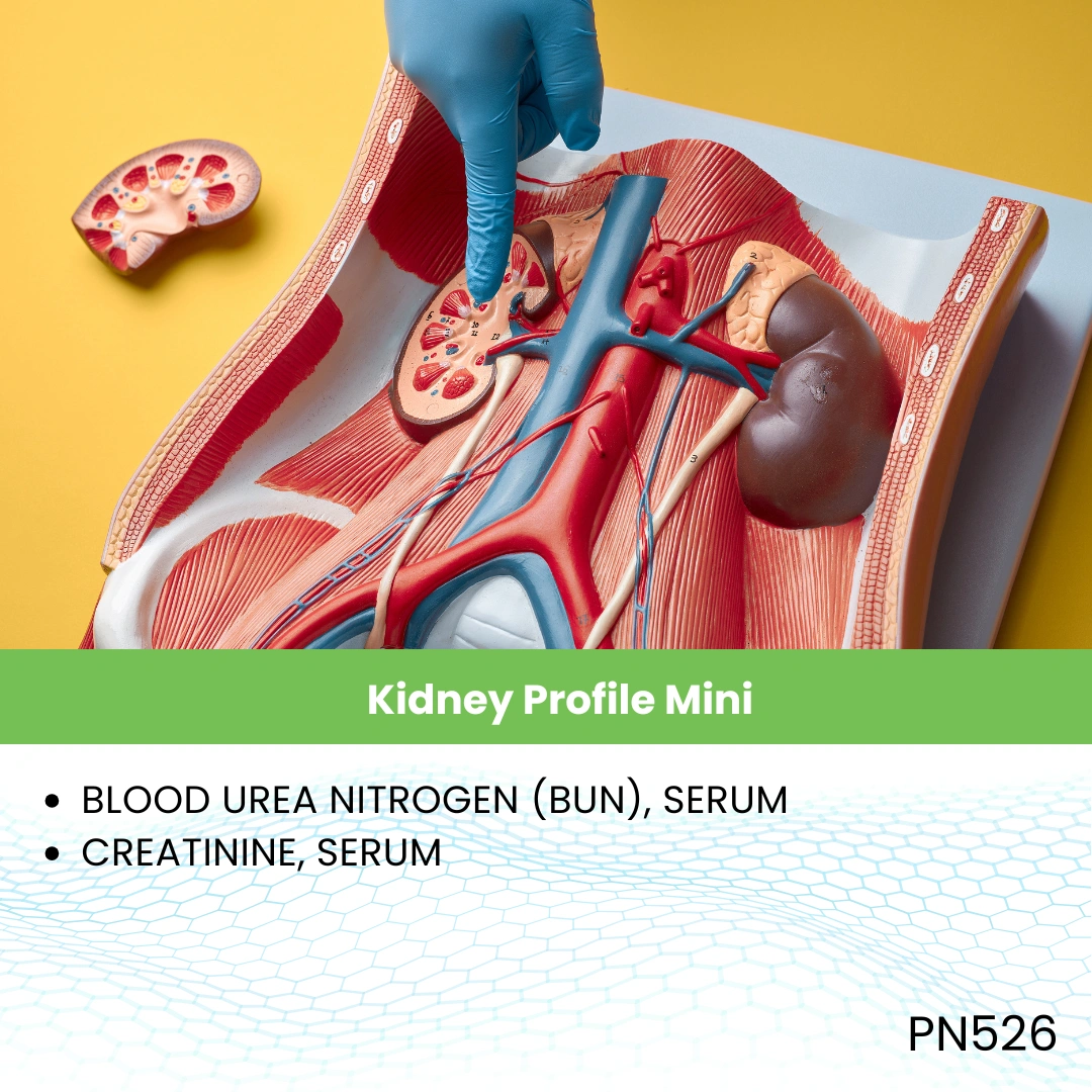 The Kidney Profile Mini is a basic screening panel that measures essential blood markers to evaluate kidney health. It generally includes serum creatinine, blood urea nitrogen (BUN), uric acid, and estimated glomerular filtration rate (eGFR). These parameters help assess how efficiently the kidneys are filtering waste products and maintaining overall metabolic balance.