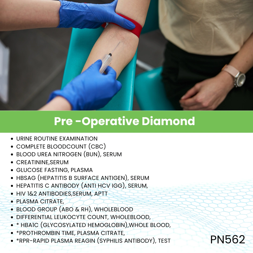 The Pre-Operative Diamond panel is a premium and most comprehensive pre-surgical health assessment package. It includes an extensive range of laboratory tests and diagnostic screenings to evaluate a patient’s overall health status, organ function, metabolic balance, and potential surgical risks. This advanced panel goes beyond the basic and advanced pre-operative tests, offering a thorough evaluation for patients undergoing high-risk or major surgeries.
