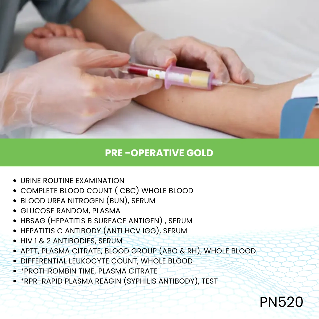 The Pre-Operative Diamond panel is a premium and most comprehensive pre-surgical health assessment package. It includes an extensive range of laboratory tests and diagnostic screenings to evaluate a patient’s overall health status, organ function, metabolic balance, and potential surgical risks. This advanced panel goes beyond the basic and advanced pre-operative tests, offering a thorough evaluation for patients undergoing high-risk or major surgeries.