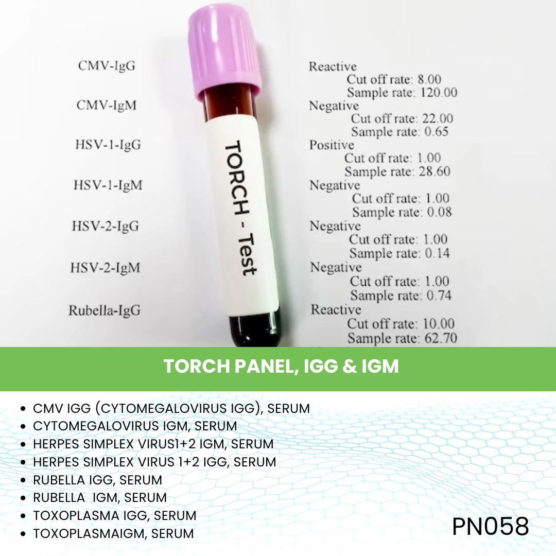 The TORCH Panel, IgG & IgM is a blood test that detects both IgG and IgM antibodies against a group of infections called TORCH. These include Toxoplasmosis, Other infections (such as syphilis, varicella, parvovirus B19), Rubella, Cytomegalovirus (CMV), and Herpes simplex virus (HSV). Measuring both IgG and IgM provides a complete picture of whether an infection is recent, past, or if immunity is present.